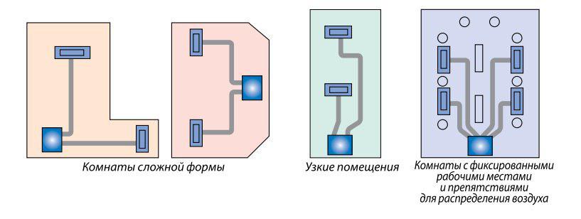 - Воздух равномерно раздается в помещения любой, даже самой сложной формы: узкие и длинные, многоугольные, разделенные перегородками.