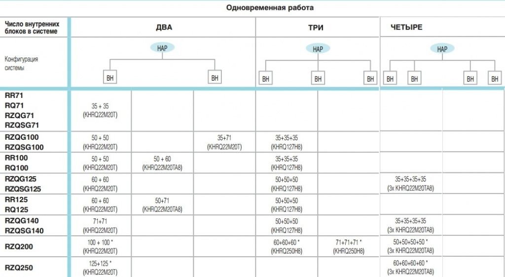 Производительность сплит-системы от 7,1 до 25 кВт можно распределить между 2, 3 и 4 внутренними блоками, смонтированными в одном помещении и работающими в режиме нагрева или охлаждения (схемы Twin, Triple и Double Twin). Использование такого соединения нескольких блоков вместо одного внутреннего блока большой производительности позволяет обеспечить равномерность температуры и воздухороспределения в помещении площадью от 70 м2, в том числе и со сложной конфигурацией.