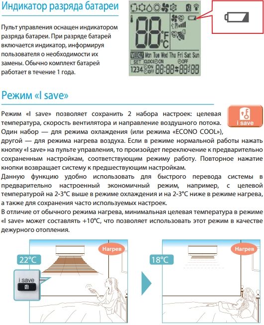 - Режим «I save» позволяет организовать экономичное дежурное отопление — минимальная температура в помещении может составлять +10°С.
