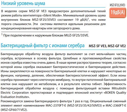 - В моделях MSZ-SF VE3 и MSZ-GF VE2 применяется бактерицидная фильтрующая вставка с ионами серебра.