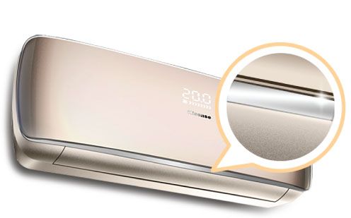Передняя панель кондиционера из двухслойного светопрозрачного пластика с прозрачным внешним слоем, благодаря чему блок смотрится воздушно и одновременно объемно |