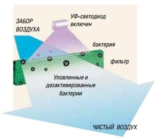 В природе бактерицидный ультрафиолет является частью солнечного спектра и обеспечивает баланс микроорганизмов в атмосфере и на земной поверхности. Специалисты HITACHI использовали метод УФ-излучения, встроив УФ-лампу во внутренний блок. Забираемый воздух, проходя через фильтр, очищается, а затем проходит обеззараживание коротковолновым ультрафиолетовым светом.