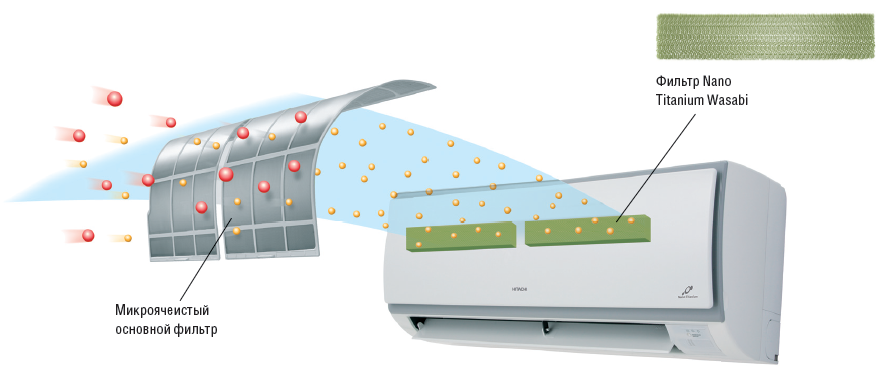 Экспериментально подтверждено, что фильтр Hitachi Nano Titanium Wasabi эффективно уничтожает более 99,99% бактерий.