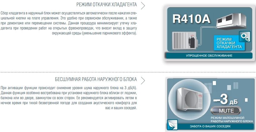 Бесшумная работа наружного блока. При активации с беспроводного пульта этой функции происходит дополнительное снижение уровня шума наружного блока на 3 дБ(А), что обеспечивает акустический комфорт для вас и ваших соседей.