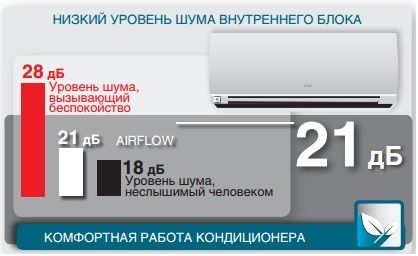• Таймер однократного включения-выключения. Позволяет выбрать одну из 4 возможных программ: ON, OFF, ON→OFF или OFF→ON. • НИЗКИЙ УРОВЕНЬ ШУМА Минимальный уровень шума при работе кондиционера Airflow составляет всего 21 дБ. Его можно сравнить с шепотом на расстоянии 1 м. В реальных условиях городской квартиры шум уровня ниже 23–25 дБ практически не слышен. На практике это приводит к тому, что работа внутреннего блока кондиционера ощущается как почти беззвучная. Минимальный уровень шума особенно важен при работе кондиционера ночью.