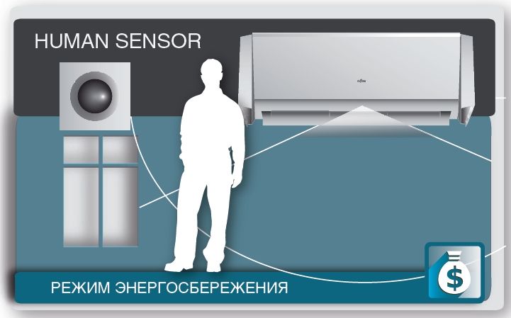 Датчик Human Sensor автоматически регистрирует присутствие людей в помещении, определяя движение и температуру. При активации данной функции кондиционер переходит в режим экономии электроэнергии. После возвращения пользователя в помещение кондиционер быстро восстанавливает работу в прежнем режиме. с технологией Human Sensor пользователю не нужно заботиться о снижении затрат на электроэнергию — интеллектуальный кондиционер Fujitsu сделает это самостоятельно.