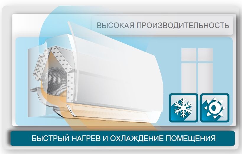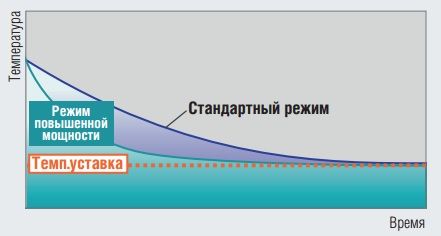 РЕЖИМ ПОВЫШЕННОЙ ПРОИЗВОДИТЕЛЬНОСТИ. В этом режиме кондиционер работает в течение 20 минут с максимальной производительностью вентилятора и компрессора, что позволяет за минимальное время охладить или нагреть воздух в помещении. Режим специально разработан для особенных случаев, когда вы не можете долго ждать, пока в помещении установится требуемая температура, например, когда с минуты на минуту вы ожидаете прихода большого числа гостей. Ваши гости будут приятно удивлены контрастом температур в помещении и на улице.