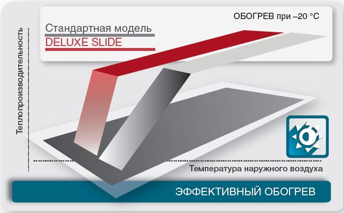 Сплит-системы Deluxe Slide способны обогревать помещение даже в 20-градусный мороз. При работе на обогрев кондиционер производит почти в пять раз больше тепловой энергии, чем потребляет электрической энергии (при уличной температуре –7 °с и выше). При температуре наружного воздуха –20 °с производство тепловой энергии более чем в 3 раза превышает потребление электрической. Такое преимущество расширяет границы использования кондиционера, превращая его в полнофункциональное устройство по круглогодичному климат-контролю.