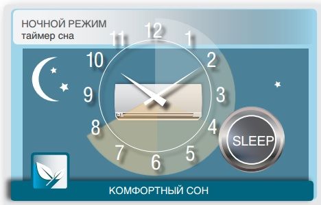 РЕЖИМ SLEEP. Комфортный сон требует температуры, отличной от температуры в период бодрствования. При нажатии кнопки SLEEP кондиционер будет автоматически изменять температуру в помещении: плавно понижать на 4 градуса при работе на обогрев (в течение первого часа на 2 градуса и в следующие 60 минут еще на 2 градуса) или повышать на 2 градуса при работе на охлаждение. Продолжительность работы в данном режиме может составлять от 30 мин. до 9 часов.