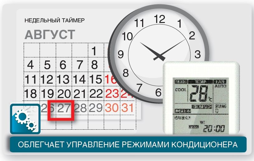 НЕДЕЛЬНЫЙ ТАЙМЕР Настройка недельного таймера, осуществляемая с беспроводного пульта, позволяет быстро и удобно задать режим работы индивидуально для каждого дня недели. Это экономит время и делает процесс эксплуатации кондиционера максимально простым и комфортным. Данная функция отлично подойдет для людей, не любящих частое «общение» с техникой: вам достаточно всего лишь один раз установить комфортные параметры для каждого дня недели, после чего кондиционер будет их автоматически поддерживать, не требуя излишнего внимания к себе.