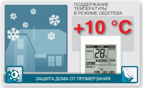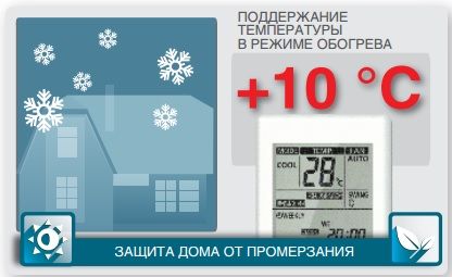 В помещениях без центрального отопления, например, в загородных домах, очень важно постоянно поддерживать минимальную положительную температуру в помещении, так как при длительном отсутствии пользователей может произойти выстуживание дома. В данном режиме сплит-система автоматически поддерживает минимальную температуру на уровне +10 °с, работая в режиме обогрева. Затраты пользователя на электроэнергию в режиме поддержания +10 °с минимальны в связи с тем, что кондиционер работает с пониженным потреблением мощности.