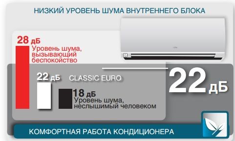 НИЗКИЙ УРОВЕНЬ ШУМА. Минимальный уровень шума при работе кондиционера Classic Euro составляет всего 22 дБ. Его можно сравнить с шепотом на расстоянии 1 м. В реальных условиях городской квартиры шумы ниже 23–25 дБ практически не слышны. На практике это приводит к тому, что работа внутреннего блока кондиционера ощущается как почти беззвучная. Минимальный уровень шума особенно важен при работе кондиционера ночью.
