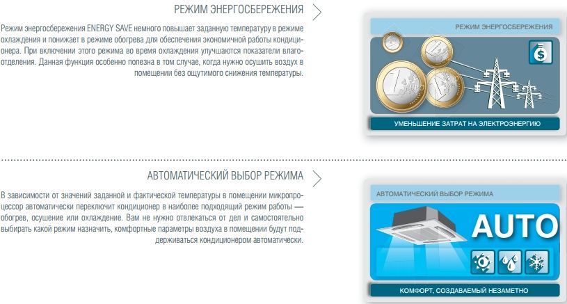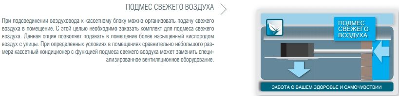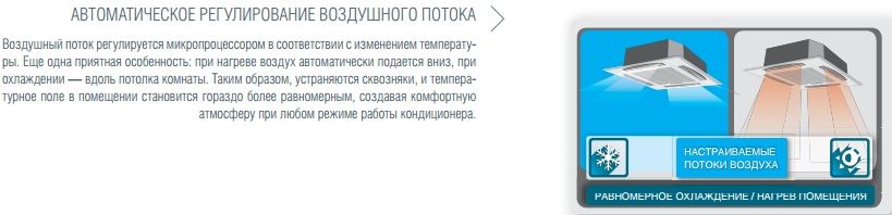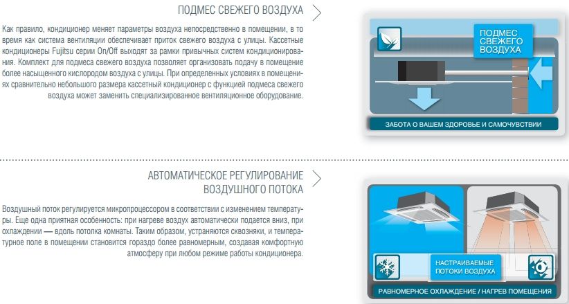 Мощные кассетные кондиционеры ТМ FUJITSU разработаны для создания приятного микроклимата в просторных помещениях, таких как офисы, выставочные залы, магазины, салоны красоты и другие коммерческие помещения. Главное достоинство кассетной сплит-системы ТМ Fujitsu заключается в эффективном распределении воздушных потоков. Благодаря функции нисходяще-восходящего автосвинга при работе кондиционера воздух равномерно распределяется по всему объему помещения, а не подается локально; тем самым кассетный кондиционер предотвращает простудные заболевания. Кассетные кондиционеры ТМ FUJITSU хорошо вписываются в любой интерьер и увеличивают свободное пространство помещения, так как монтируются в подвесной потолок. При этом для установки внутреннего блока достаточно всего 215 мм* (265 мм**) межпотолочного пространства. Конструкция данной модели позволяет осуществлять подмешивание свежего воздуха с улицы и подсоединять дополнительный воздуховод для удаленного распределения воздуха, а также ограничить подачу воздуха с одной или двух сторон внутреннего блока. Отсутствует необходимость дополнительно приобретать дренажный насос — он входит в стандартную комплектацию кондиционера.