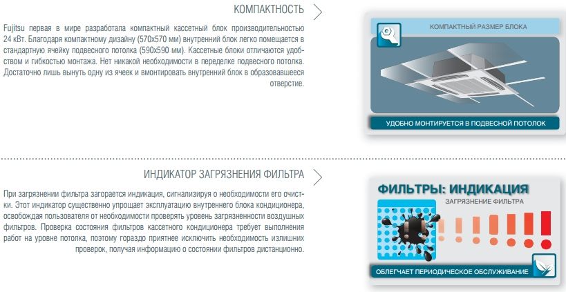 Компактный инверторный кассетный кондиционер Fujitsu — одна из лучших сплит-систем полупромышленного назначения на климатическом рынке. Именно Fujitsu впервые предложила компактную кассетную модель мощностью 7,1 кВт. Внутренний блок кондиционеров этой серии обладает уникальными характеристиками: это оригинальная разработка Fujitsu — турбовентилятор внутреннего блока с усовершенствованными лопастями — обеспечивает равномерное и практически бесшумное распределение воздуха. Отличительная особенность кассетных кондиционеров Fujitsu заключается в эффективном использовании пространства и отсутствии сквозняков. В компактных инверторных кассетных моделях предусмотрена возможность подачи свежего воздуха через дополнительный воздуховод. * Можно также подключить воздуховоды для удаленного распределения воздуха*. Габариты этой модели идеально подходят для установки в подвесные потолки евро стандарта. Благодаря малозаметности и низкому уровню шума эти кондиционеры являются идеальным решением для кондиционирования жилых помещений и офисов.