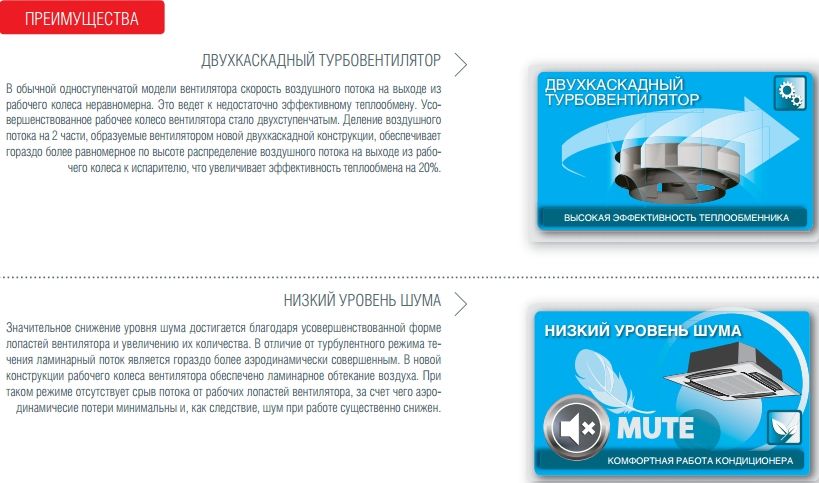 Четырехпоточное распределение воздуха, малозаметная установка за подвесным потолком, возможность работы в режиме высоких потолков делают инверторные кассетные кондиционеры Fujitsu оптимальным решением для кондиционирования просторных помещений коммерческого назначения: ночных клубов, кафе и ресторанов, учебных аудиторий. Также полноразмерные кассетные кондиционеры используются для кондиционирования нескольких помещений одновременно благодаря подключению дополнительных воздуховодов*. Уникальная разработка Fujitsu — высокоэффективный турбовентилятор —, обеспечивает равномерное и практически бесшумное распределение воздуха. Благодаря усовершенствованной форме лопаток значительно снижается шум и турбулентность потока, что приводит к тихой и экономичной работе кондиционера.