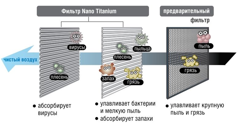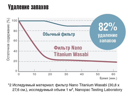 - ФИЛЬТР NANO TITANIUM WASABI. Это уникальная разработка, которая использует васаби-модифицированный Nano Titanium катализатор для достижения мощного эффекта защиты от бактерий, плесени, аллергенов и посторонних запахов.