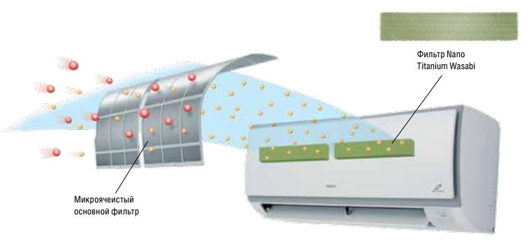 Nano Titanium Wasabi фильтр. Фильтр Nano Titanium Wasabi – это уникальная разработка, которая использует васаби-модифицированный Nano Titanium катализатор для достижения мощного эффекта защиты от бактерий, плесени, аллергенов и посторонних запахов. Фильтр кондиционера Nano Titanium Wasabi с экстрактом васаби имеет ярко выраженные антибактериальный, антиаллергенный и дезодорирующий эффекты. Экспериментально подтверждено, что фильтр Hitachi Nano Titanium Wasabi эффективно уничтожает более 99,99% бактерий. Фильтр Nano Titanium Wasabi эффективно борется с такими аллергенами как клещи домашней пыли и формальдегид.
